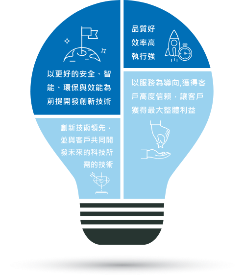 未來展望 基於公司的核心競爭能力與公司核心價值,不斷成長。 使人類社會與自然有更好的未來。 成為全球最先進及最具有競爭力的測試整合技術系統服務業者,並與我們的客戶共同組成產業鏈中堅強的競爭團隊。 為了實現此一願景,我們必須擁有以下能力: